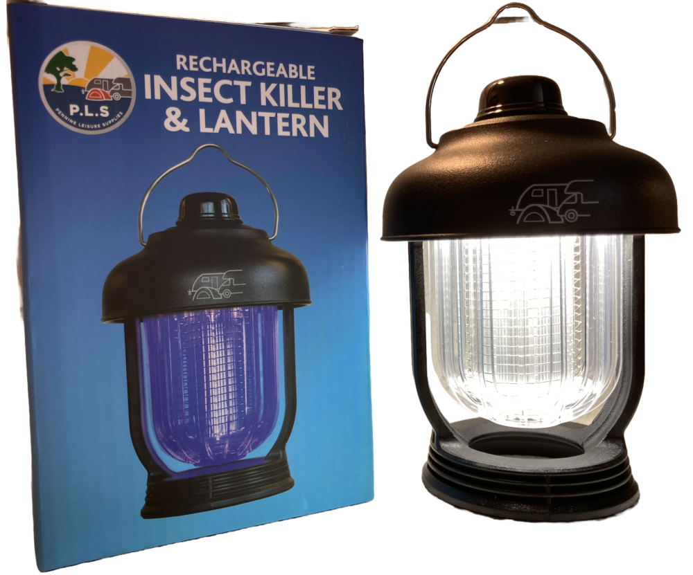 PLS Rechargeable Insect Killer & Lantern. Features Include UV Insect Killer LED, Dimmable Lantern, Two Way Lantern, Adjustable Brightness, IPX Waterproof, Built in Battery, Type-C Charging and Fold Down Hanger. Size: Overall Height including Handle Approx 170mm x 100mm.