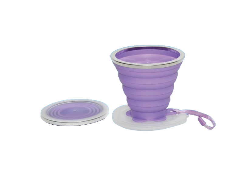 Collapsible Cup 240ml in Lilac. Silicone Cups come with a Plastic lid and hanging rope. Suitable for drinking water and Other Beverages. Made from Food safe Silicone & Plastic. BPA Free. Collapses Flat to 8mm Expands to 70mm Approx Sold in singles or Outer Boxes x 40.