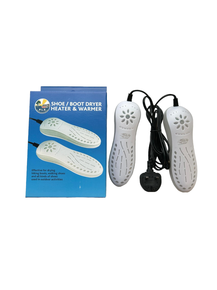PLS Shoe & Boot Dryer & Warmer. Suitable for Shoe Sizes UK 5 - 11. Colour: White. Effective for Drying Hiking Boots, Walking Shoes and all kinds of Shoes used in Outdoor Activities. Optimised Heat Circulation effectively Removes Moisture, Dampness and Odours from Shoes. Voltage: Max 250v Power 15w Ip rating IP20