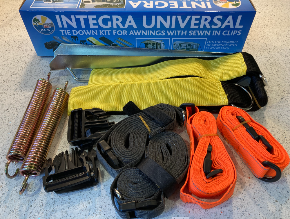 PLS Box of 12 x The Integra Universal Awning Tie Down Kit now has more clip combinations so it will fit a larger number of awnings with sewn in clips. It also has had a reflective band added to each strap. Originally fitted the DOREMA and PYRAMID awnings it now also fits the majority of QUEST, STARCAMP, KAMPA, NR and SUNNCAMP awnings. Also Sold in singles BG500