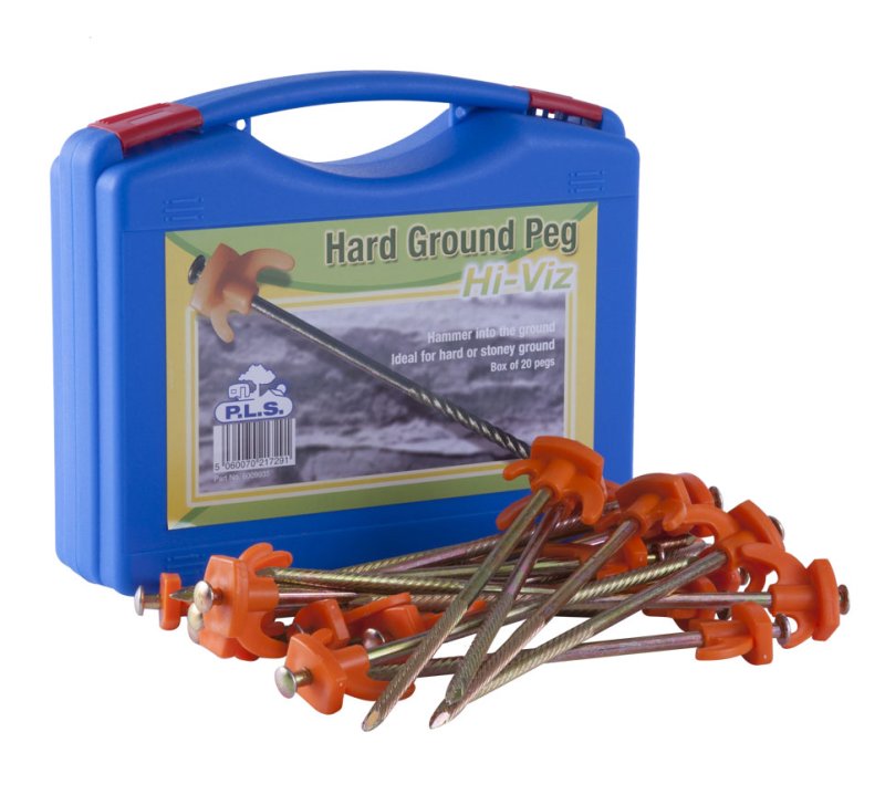 PLS Box of 20 x Hard Ground Peg with Hi-Viz Plastic Hook This handy storage box of 20 x Hard Ground Peg Orange Hiviz Top. Heavy duty 20cm metal peg with Orange Hiviz plastic top and hook for easy removal. Suitable for awnings, tents, gazebos, etc. Sold in singles or Outer Boxes x 12.