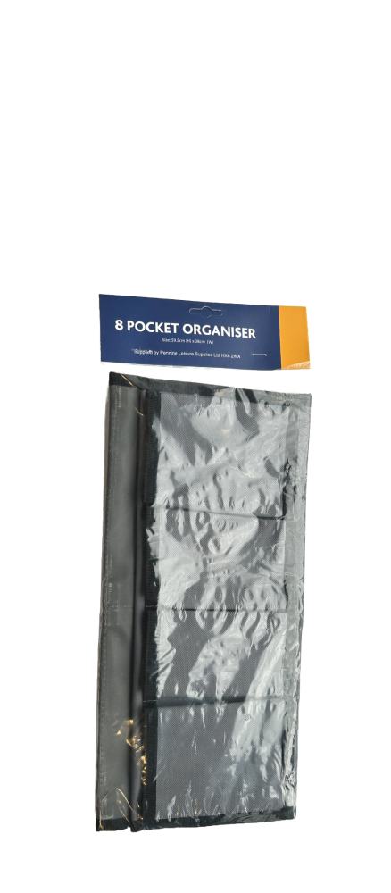 PLS Caravan Organiser - 8 Pocket . This Hanging Organiser is Great for Storing Shoes, Boots, Hats, Clothes, Linens, Arts & Crafts, Toys and Much More. 8 individual Pockets. Can be hung using fitted eyelets. Size: Approx W38xH59.5cm