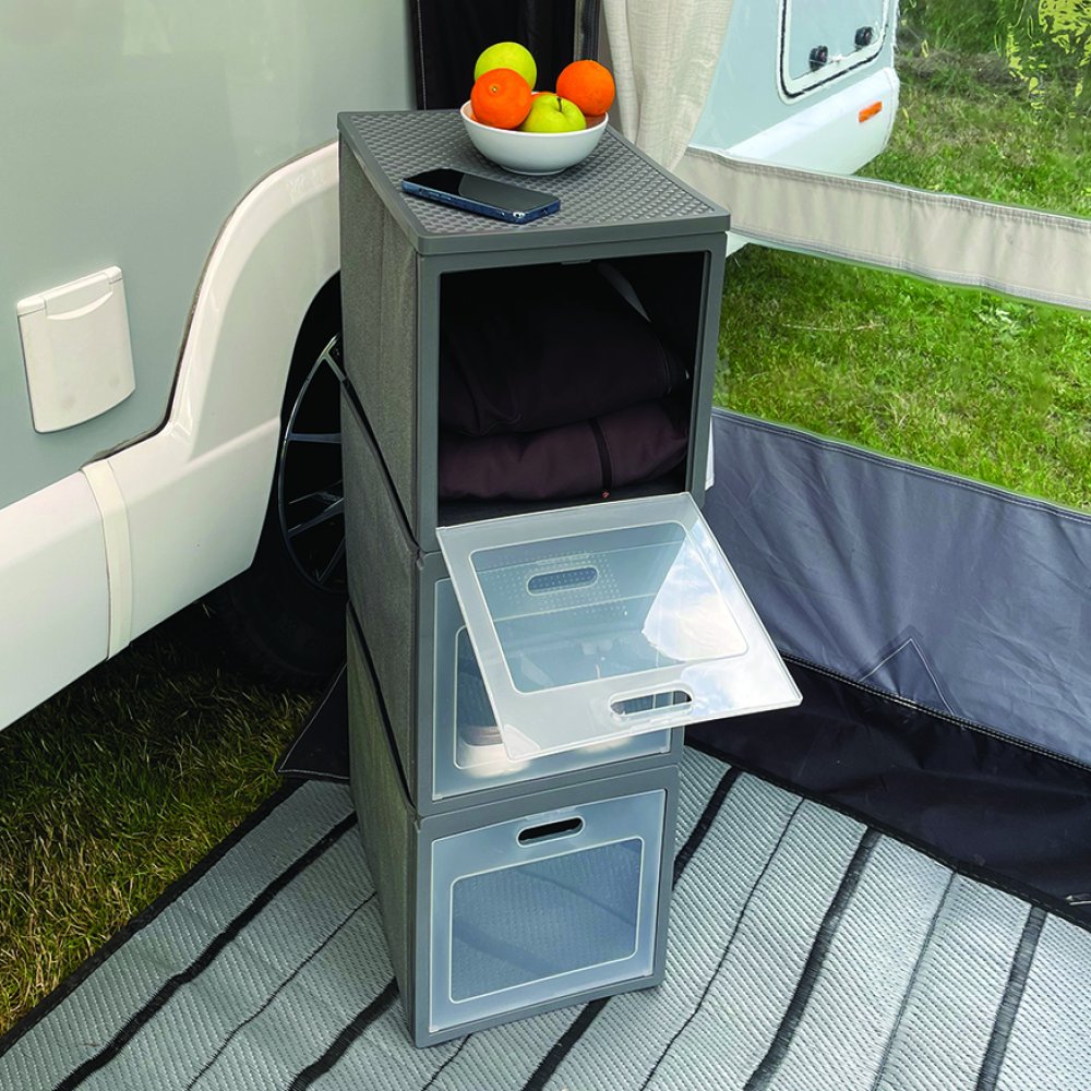 Cabibox 3 tier storage unit. Stylish design, 3 storage compartments. Easy to brush clean, grey linen non-woven fabric sides and wipe clean surfaces and doors. Ideal for motorhomes, caravans and the home. Compact, lightweight and foldable for easy storage. Size when assembled: 90cm H x 30cm W x 40cm D. Also available as a 2 tier storage unit - HA78020.