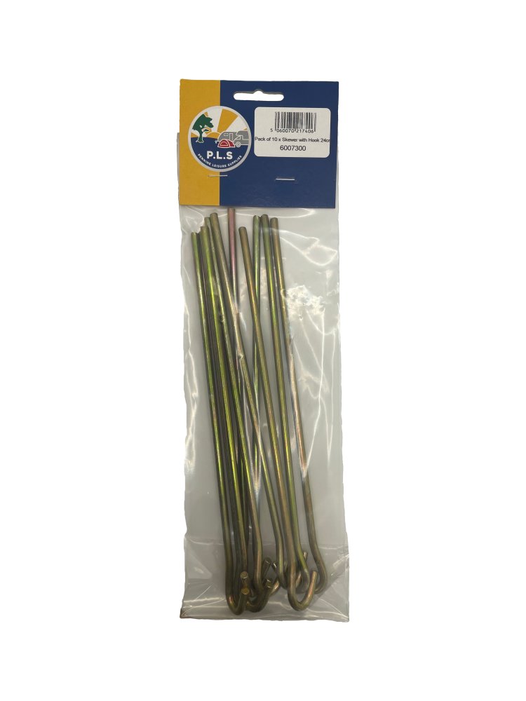 PLS Bagged with Header card. 10 x Skewer With Hook 24cm For general camping use.