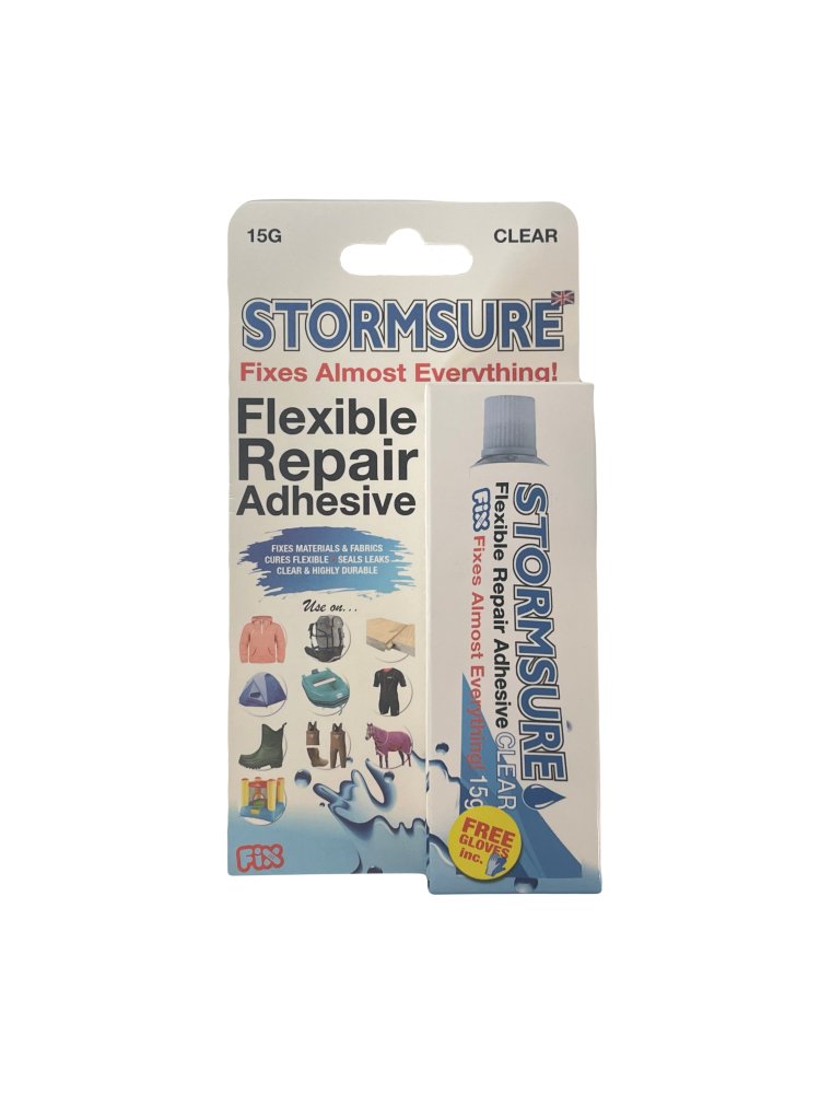 STORMSURE Adhesive - 1 x 15g Tubes. Stormsure Flexible Repair Adhesive is a very strong general purpose adhesive and it can also be used as a surface sealant. It exhibits special characteristics unlike many adhesives as it is highly flexible and stretchy after it has cured but it remains very strong. It fills gaps well, it is suitable for use indoors and outdoors and in marine environments. The adhesive can be painted on top of a surface to make it waterproof, airtight or abrasion resistant. Stormsure adhesive can often be used to cover holes without a patch. A thick film of adhesive will make a good repair. If the glue will drip through the hole just place some sticky tape behind the hole before applying the glue. It can be removed once the glue has cured. Stormsure Flexible Repair Adhesive bonds to virtually all surfaces including neoprene, rubber, leather, PVC, polyurethane, breathable and coated fabrics, wood, metal and more. It is ideal for repairing cracks in rubber wellington boots, hiking boots, loose soles, leaks in waders, rips in wetsuits, damaged horse rugs, holes in tents and canopies, leaks and splits inflatable items and many other items too.