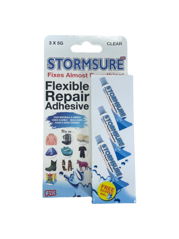 STORMSURE Adhesive - 3 x 5g Tubes. Stormsure Flexible Repair Adhesive is a very strong general purpose adhesive and it can also be used as a surface sealant. It exhibits special characteristics unlike many adhesives as it is highly flexible and stretchy after it has cured but it remains very strong. It fills gaps well, it is suitable for use indoors and outdoors and in marine environments. The adhesive can be painted on top of a surface to make it waterproof, airtight or abrasion resistant. Stormsure adhesive can often be used to cover holes without a patch. A thick film of adhesive will make a good repair. If the glue will drip through the hole just place some sticky tape behind the hole before applying the glue. It can be removed once the glue has cured. Stormsure Flexible Repair Adhesive bonds to virtually all surfaces including neoprene, rubber, leather, PVC, polyurethane, breathable and coated fabrics, wood, metal and more. It is ideal for repairing cracks in rubber wellington boots, hiking boots, loose soles, leaks in waders, rips in wetsuits, damaged horse rugs, holes in tents and canopies, leaks and splits inflatable items and many other items too.