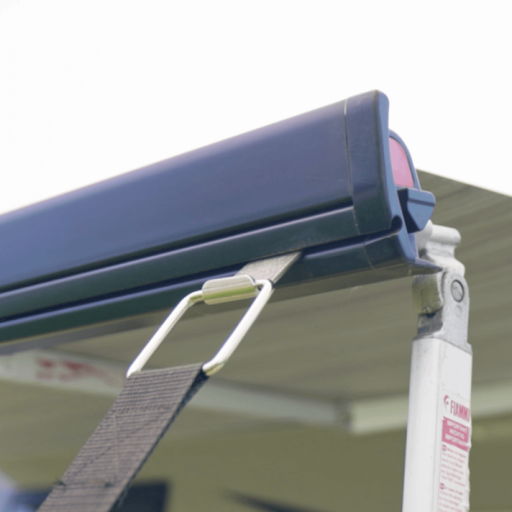 HABA Box of 12 x Fiamma and Thule Tie Down Kit. A universal tie down set, suitable for various box and cassette awnings .The set consists of 2 large solid ground pegs, 2 tension springs, 2 straps with plastic hook of 4.8mtr and 2 triangular straps that slide into the front box of the awning. The strap is 4.8m x 17.5 cm wide x 6.5 mm.