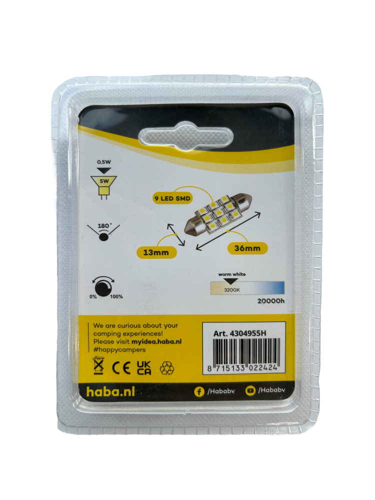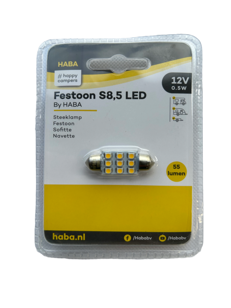 HABA S8.5 Festoon 12v 0.5w LED Bulb 5 LED Warm White. 0.5 Watt Equivalent to 5watt. Size: 36mm x 13mm
