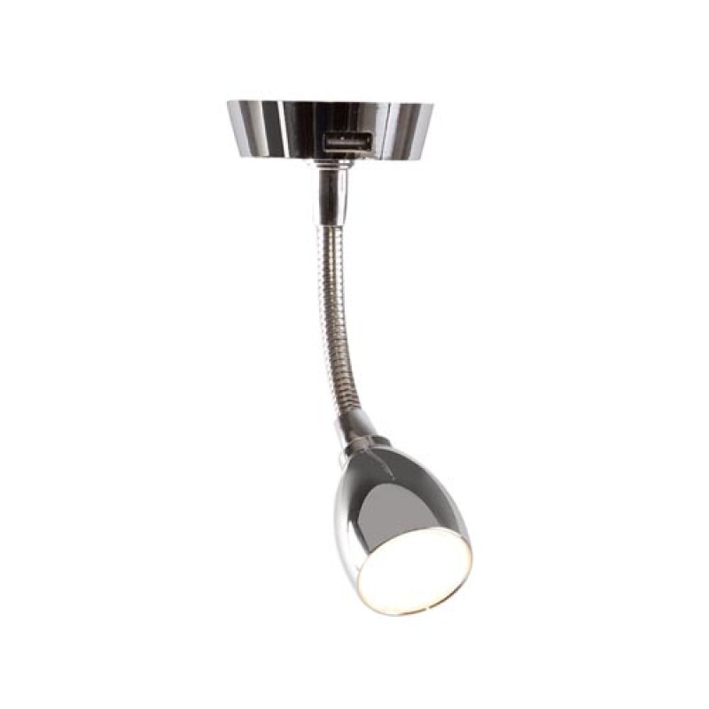 Leisure Glow Hercules. Button Operated, Flexi Arm & USB on Base Light. Finish: Chrome. Base Diameter: 55mm. Base Height: 15mm. Overall Height: 147mm. Voltage: 2.5w - 12v. 6 LEDS, 4000K Cool White. Weight: 70g. Connection Type: Bare Ends.