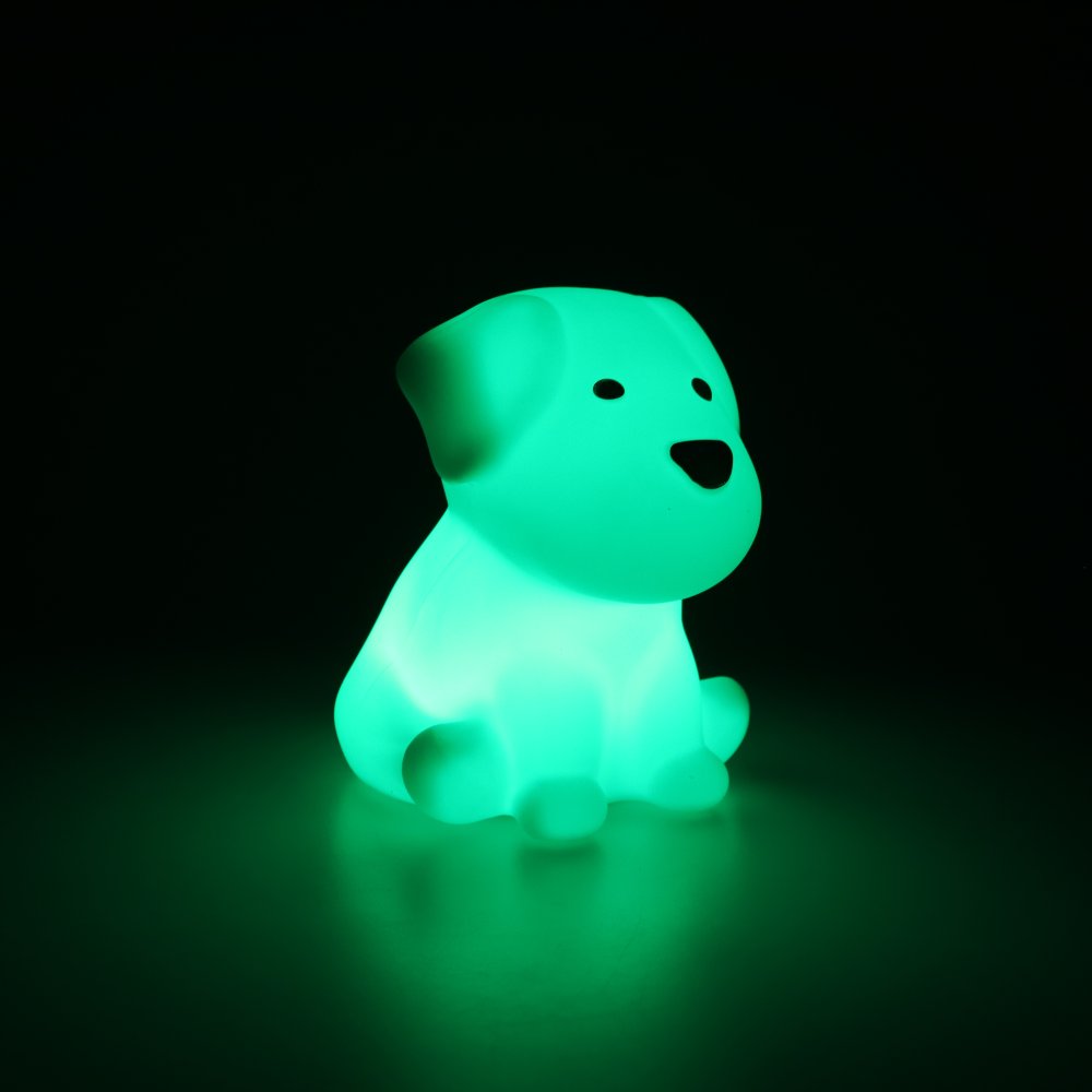 LED Rechargeable DOG Night Light. A light source of 4 RGB LED and a power supple of 1PC 3.7V 1200mAH 18650 battery (INCLUDED). ON-OFF switch at the bottom, tap switch to change colour. 7 changing colours - 7 flashing colours - 7 single colours (red-blue-green-pink-purple-orange-white-OFF). Size: 12x12x12.5cm