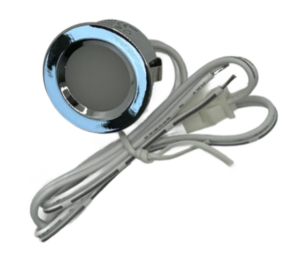 PLS 1 x LUNA 12 Volt LED Spotlight. LED Spotlight is a perfect spotlight for your campervan, caravan or motorhome. Power ? 1W. Input ? 12VDC (CV). CCT ? 4000K. 30mm Diameter x 15mm deep. Supplied with 44.5cm long wire and connection.