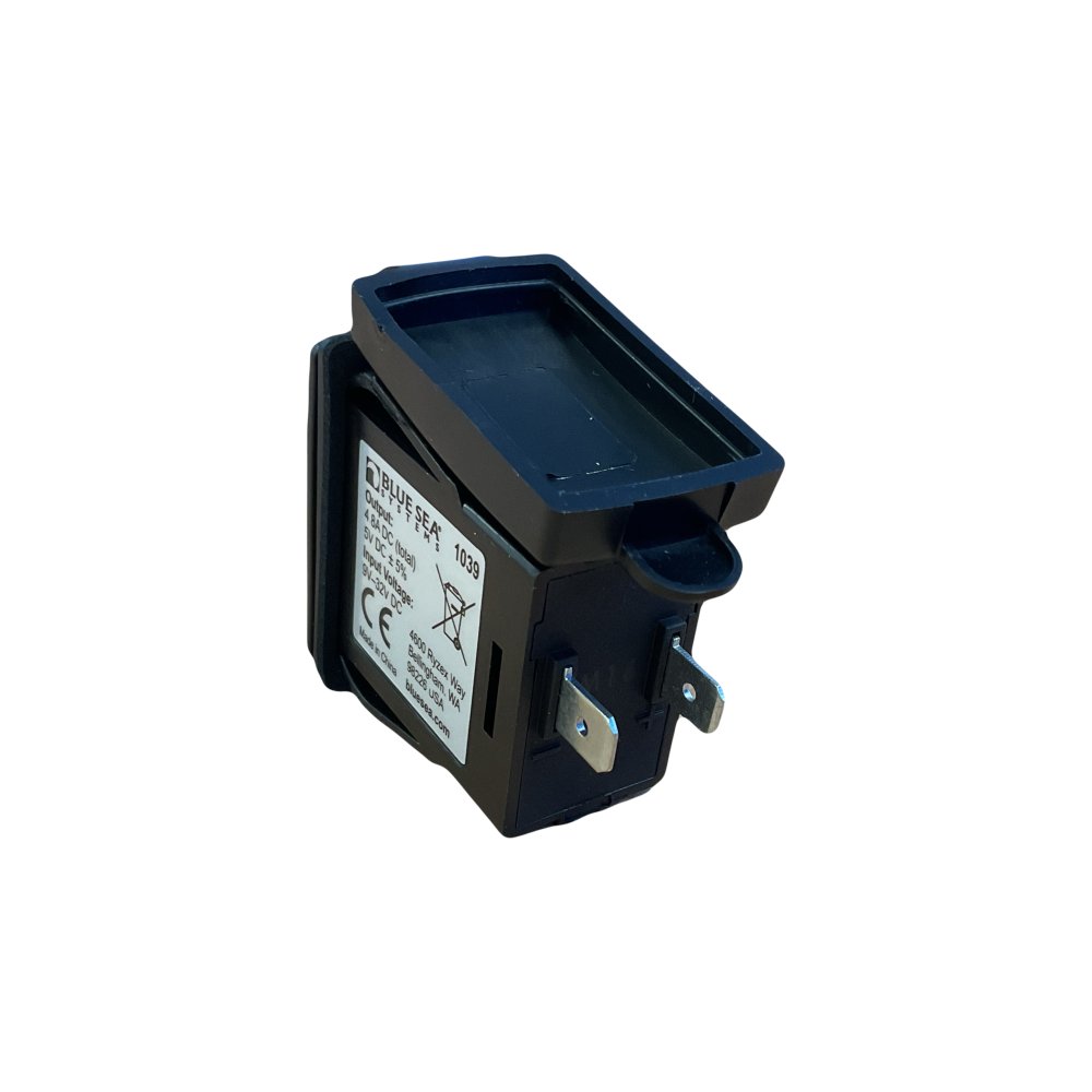 12/24V DUAL USB 4.8A CHARGER. This product has reduced electronic interference, over temperature protection, conformal coated for the harsh marine environment and it has a protective cap that keeps debris and moisure out. Maximum output current - 4.8A DC(total). Input voltage - 9V-32V DC. Output voltage - 5V DC give or take 5%. Parasistic current draw - 1mA. Thermal overload protection - YES. Short circuit protection - YES. Reverse polarity protection - YES. USB - 2.0, Type A. Cut-out dimensions - 1.45" x 0.83" (37 x 21.1mm).