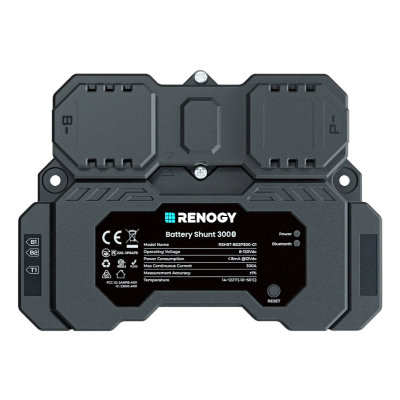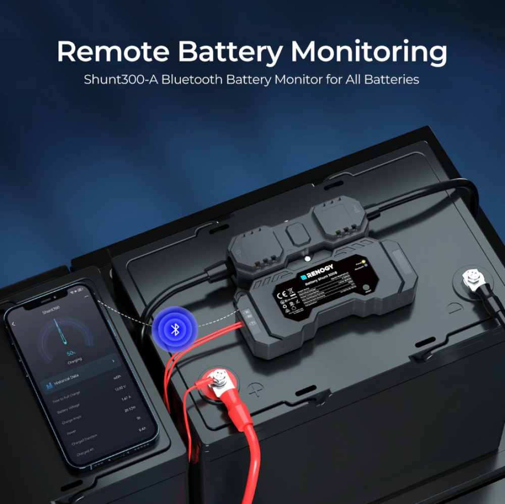 Renogy Battery Shunt 300 with Bluetooth. Remote monitoring and control via Renogy ONE/DC Home App. Compatible with various batteries. Lead Acid, LFP, Li-ion, and Ni-MH. Displays State of Charge, temperature, and starter battery voltage. Records historical data and issues alerts via DC Home app. Dimensions approx. 134 x 97 x 31mm.