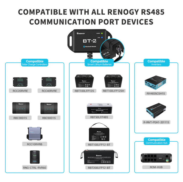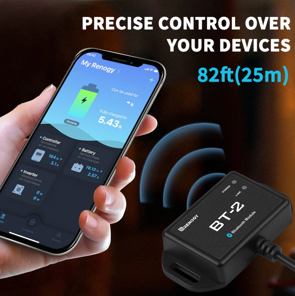 Renogy BT-2 Bluetooth Module. The Renogy BT-2 is the new generation Bluetooth module for select Renogy solar charge controllers, DC-DC battery chargers, smart lithium batteries, and inverters. Powered by its RJ45 communication port, the BT-2 provides wireless monitoring of the system data and allows users to change parameters through the Renogy DC Home smartphone App. The Renogy DC Home App can help make your off-grid power system smarter by giving you access to configure, monitor, update, and diagnose your Renogy products from the convenience of your smart phone or tablet. Dimensions approx. 67.3 x 35 x 14mm. Cable length 5m.