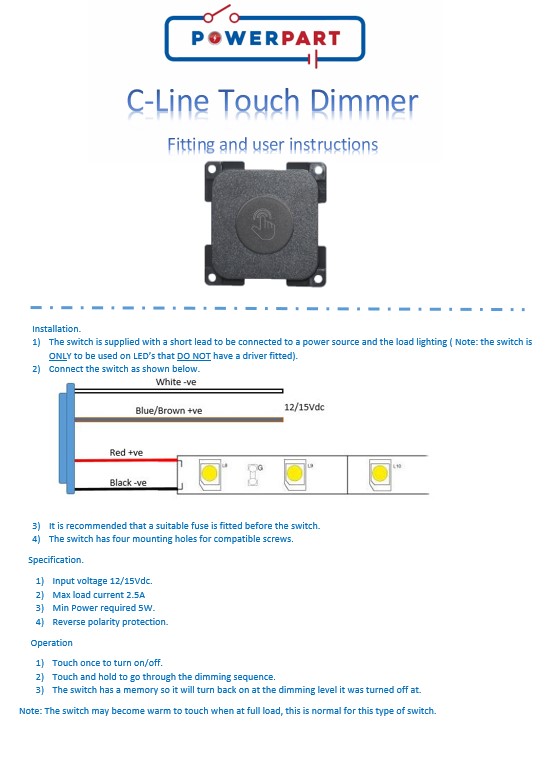POWERPART C-Line Range. Bagged with Header card. 1 x C-Line Touch Panel Switch DARK GREY. C-Line is a modular range of wide range of electrical Components & Facias that mix and match to suit whatever your requirement you have. They are interchangeable with CBE Style Facias etc. Fitted in a wide range of Caravans & Motorhomes including Bailey, Elddis, Adria & Coachman. This unit is onlysuitable for use with a combined minimum total wattage of +5W and maximum 30W.