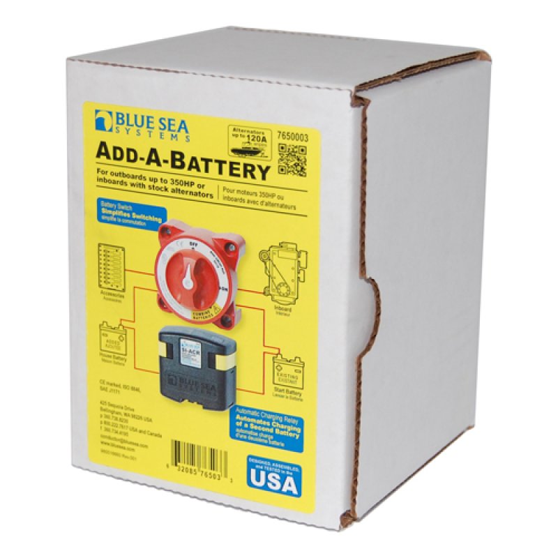 Adding a second battery to the electrical system prevents the unintended discharge of the engine start battery. Blue Sea Systems popular Add-A-Battery kit was primarily designed for boats with alternator output of 120A or less. When installed, the Add-A-Battery isolates the start battery from the house loads which prevents the discharge of the start battery. The Add-A-Battery offers a simple way to control the charging and battery switching of two battery banks. The E-Series Dual Circuit Plus? Battery Switch simplifies the switching while the SI-ACR automates charging between two batteries.