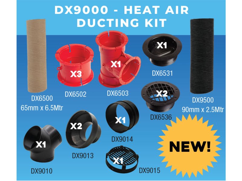 Optional ducting accessory kit for WHALE Heat Air Space Heaters. Kit contains: 1 x 90mm Y-Fitting, 2 x 90mm-65mm Reducer, 1 x 90mm Straight Connector, 1 x 90mm Grill, 1 x 65mm Fixed Open Vent, 1 x 65mm Adjustable Vent, 3 x 65mm Straight Fitting, 1 x 65mm T-Fitting. 2.5 Mtrs x 90mm Ducting Pipe, 6.5 Mtrs x 65mm Ducting Pipe. 4 x 90mm Hose Clamps, 4 x 65mm Ducting Clamps