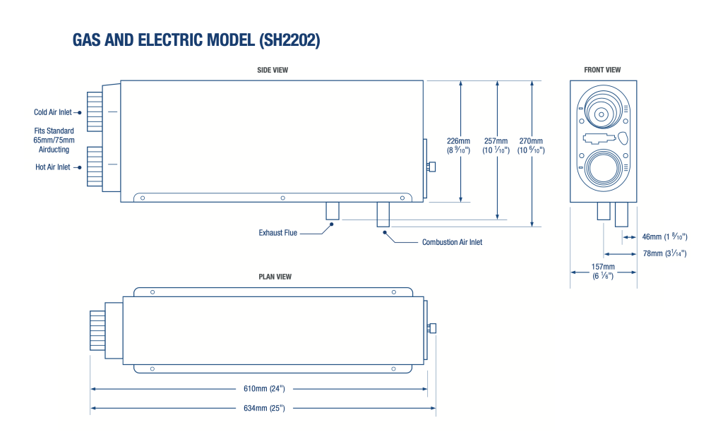 WHALE Gas & Electric Space Heater is a compact, lightweight internal 2kw Space Heater will fit neatly inside a bunk or cupboard and runs on gas and or mains electric. Contents: Space Heater, Wiring Harness & Control Panel. Please Note. Requires: Flue Kit available seperately FK2125 or FK2200.