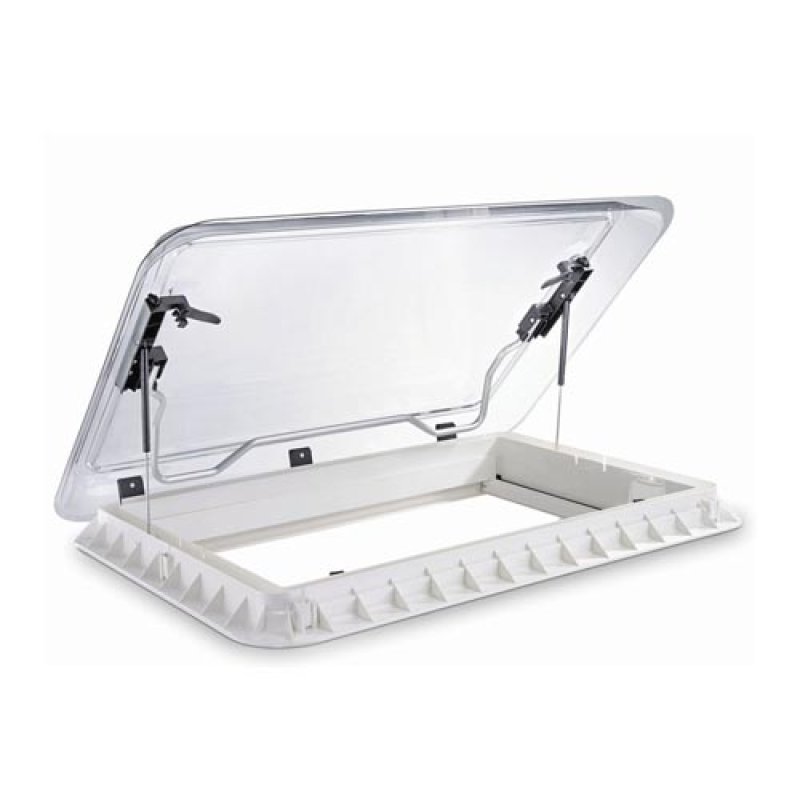 DOMETIC HEKI 2 Rooflight 960 x 655 Complete. Suitable for roof thickness from 25-60 mm. The Dometic Heki 2 admits lots of light and fresh air into caravans. A roller fly screen and darkening blind are mounted on the inner frame and can be adjusted independently or together. The window panel is easy to open using a metal bar handle and has pneumatic springs to hold it securely in place. A bad weather position keeps rain out while preventing the wind from lifting the panel. Enjoy fresh air and light at your own convenience. Installation requires a flat surface areaof 1100mm x 820 mm. Can be installed long or across to the vehicle roof.. Net weight 11 kg. Cut out area 960mm x 655mm. Opening angle max 55.00 degrees and 3 fixed opening positions.