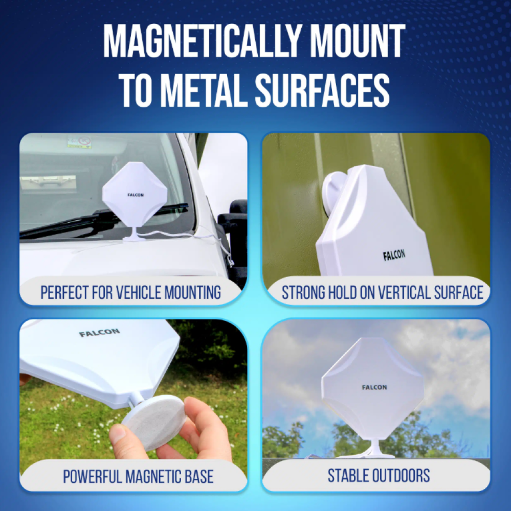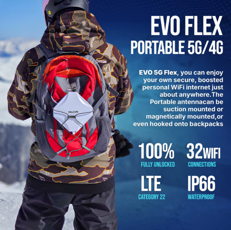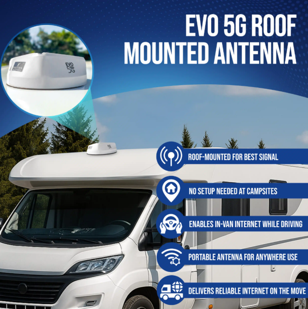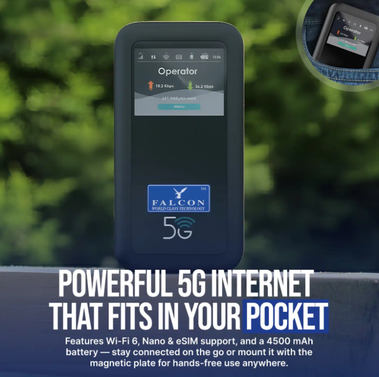 Falcon EVO 5G Flex ? Roof Mounted + Portable Amplified Internet Solution including 3400Mbps 5G Portable Router (Nano/eSIM). 5G Omni Directional Antenna with 4G Fallback with Portable Router. Flexible Amplified Mobile Internet Anywhere. New eSIM compatible 5G 3400MBPS Portable Router. Router Charging Docking Station included. Router Carry Case Included.