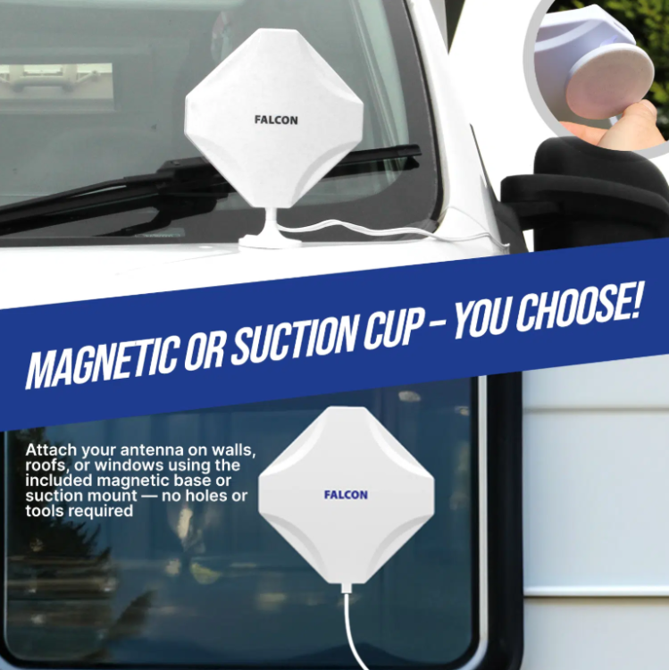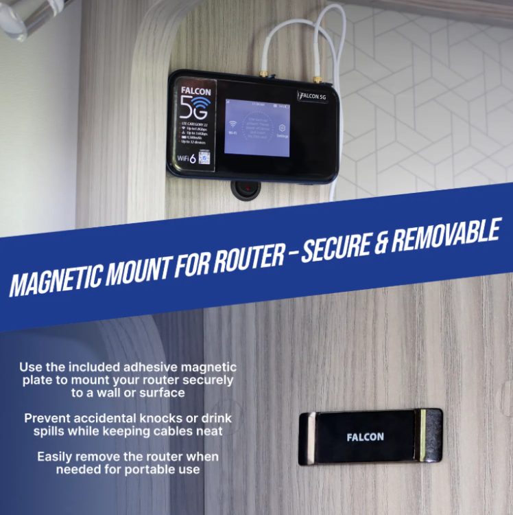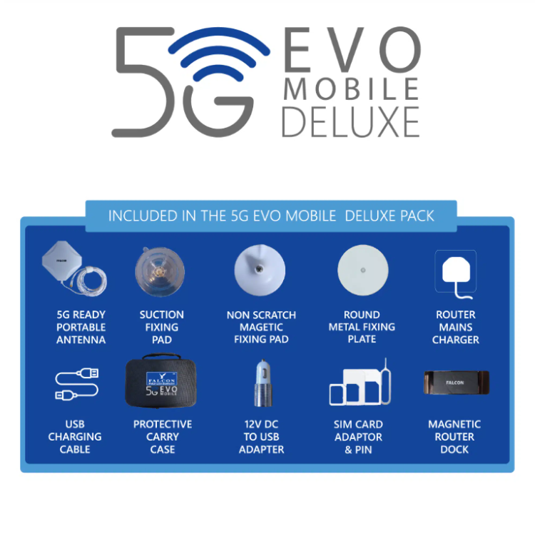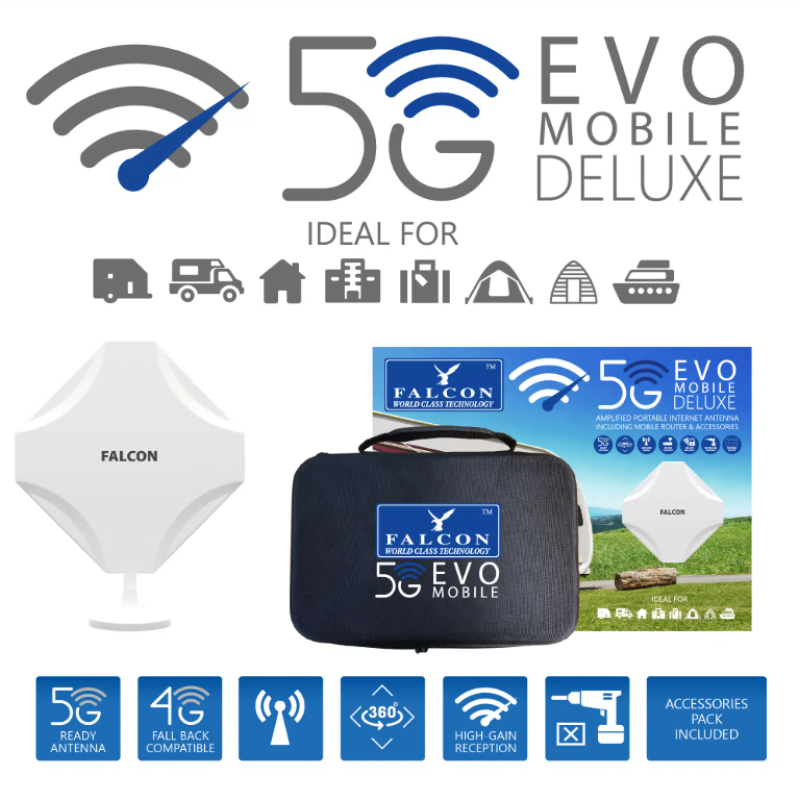 Falcon EVO Mobile 5G DELUXE SET 3400mbps. Falcon EVO MOBILE, Mobile Broadband Internet, 5G ready MiMo windo antenna for motohomes and caravans with 3400MBPS (5G) Portable Router (eSIM Compatible). Designed for mobile internet wherever you are. Ideal for Campervans, tents, mobile offices, cars, caravans, motorhomes, boats and just about anywhere... An easy portable EVO MOBILE solution for caravan and motorhome WiFi. A suction mounted window antenna with a WiFi hotspot allowing you to connect uo to 32 devices at once and get up to two and a half times the performance of your mobile phone.