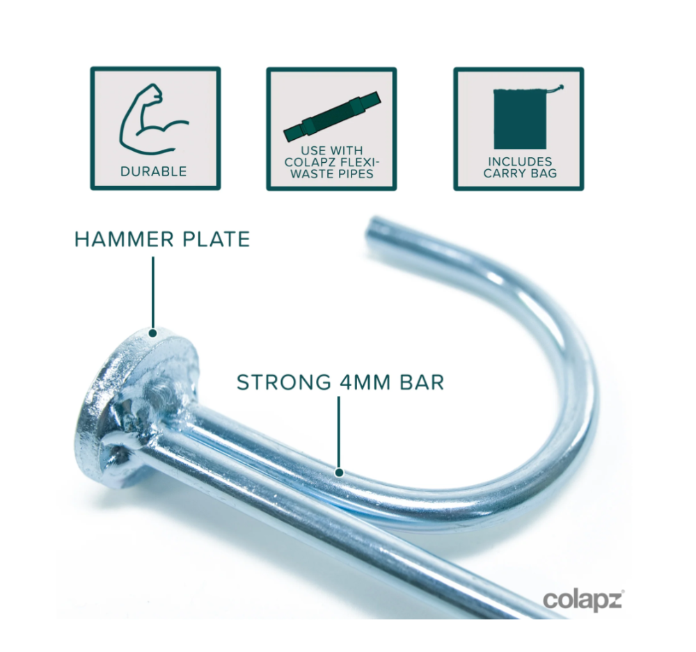 10 pegs per pack - 30cm length. Made from 6mm galvanised metal, so super strong and durable for soft or hard ground. Includes drawstring carry bag with a reinforced bottom, to keep them together when not in use. Great to allow you to adjust the height, position & direction of your Colapz flexi waste pipe KIT also available to purchase here or any standard rigid or flexible waste pipes.