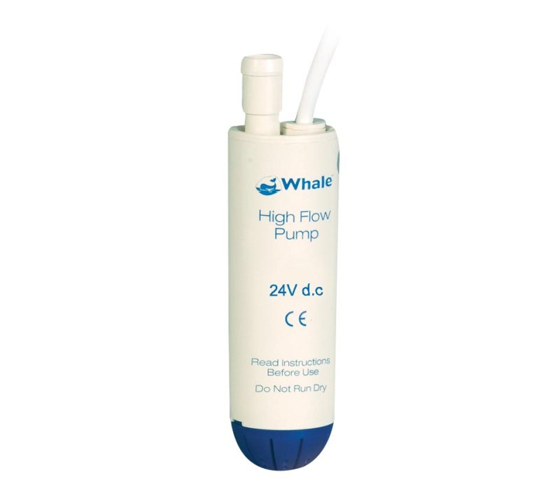 WHALE 1 x WHALE Submersible Premium Pump 24 Volt. Premium Submersible Electric Galley Pump 13 ltr/ min, 3.6 amps / 1.0 Bar 24V d.c. Simple, compact and an economical solution Long life, very quiet with low power consumption An inexpensive way to update a manual to an electric system For best performance: Maximum continuous operation should not exceed 15 minutes Do not run pump dry as it will cause pump damage Do not use to pump water that is over 60oc We recommend the pump stands vertically in the tank Before switching on, place the pump in water and shake for a few seconds to release trapped air. This will ensure successful priming and should be repeated after refilling the water tank.