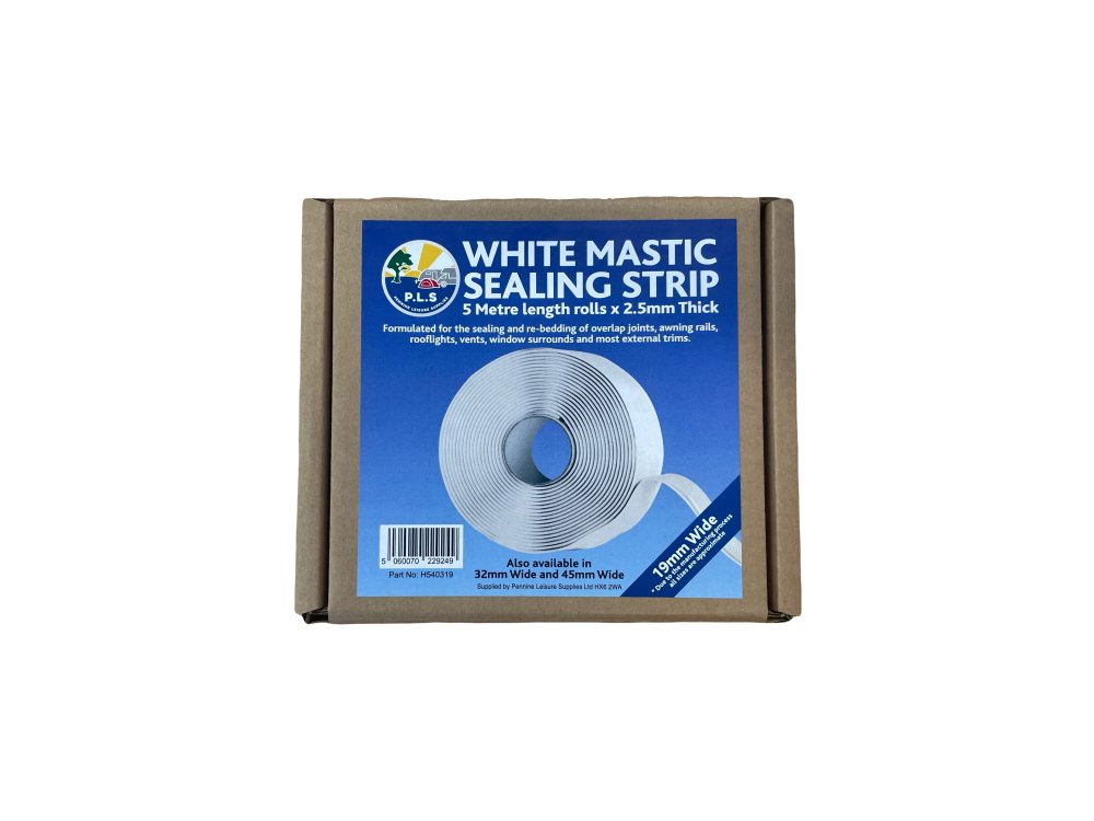 PLS Retail Boxed 1 x 5 Mtr Roll Mastic Sealing Strip 19mm x 2.5mm. Formulated for the sealing and re-bedding of Caravan & Motorhome overlap joints, awning rails, roof lights, vents, window surrounds and most external trims.